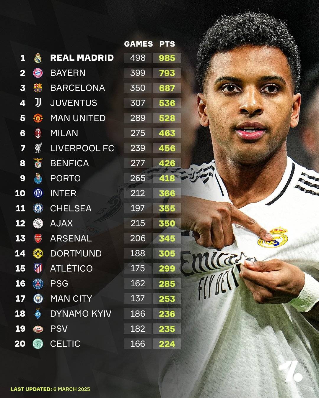 直播吧03月08日讯 在OneFootball公布的欧冠历史积分榜上,皇马以498场比赛积985分的成绩高居榜首,拜仁399场积793分排在第二位,巴萨350场比赛687分位列第三。