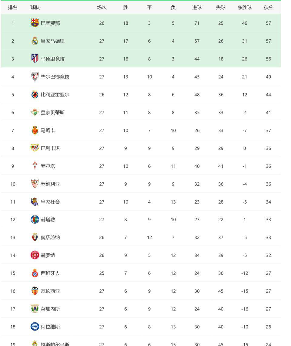 西甲联赛的赛程同样不够规整,部分比赛被延期。尽管巴塞罗那目前少赛一场,但他们仍然力压皇家马德里排名榜首。然而,巴萨的领先优势并不稳固,他们与皇马同积57分,而排名第三的马德里竞技也只落后1分,本赛季西甲冠军的归属仍然充满悬念。