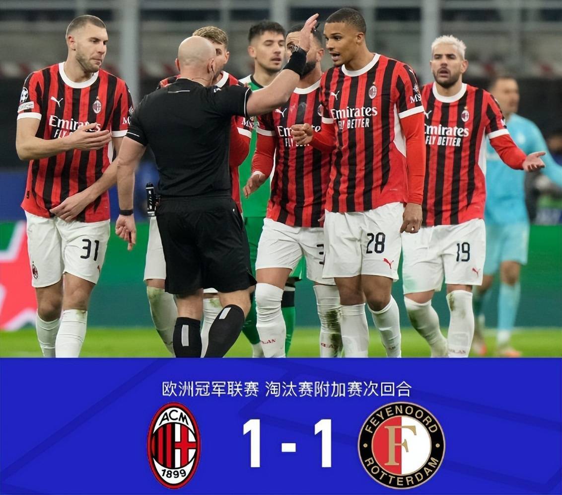 在2025年2月19日进行的欧冠淘汰赛附加赛次回合比赛中,AC米兰在主场以1-1战平费耶诺德,总比分1-2被淘汰出局。这场比赛的失利让红黑军团无缘欧冠16强,也让球队的复兴之路再次蒙上阴影。