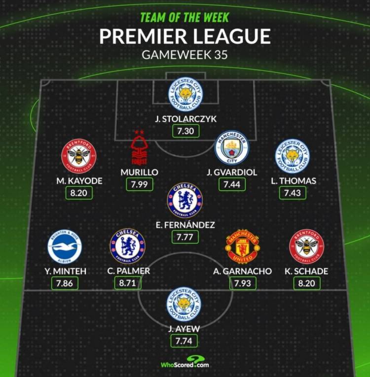 Whoscored评本轮英超最佳阵:恩佐领衔,加纳乔、帕尔默在列 admin 2025年05月07日 00:31 29 0 直播吧5月6日讯 英超第35轮战罢,数据网站Whoscored也盘点了本轮比赛评分最高阵容,其中加纳乔、恩佐等在列,具体如下:门将:斯托拉奇克(莱斯特城)后卫:卡约德(布伦特福德)、穆里略(诺丁汉森林)、格瓦迪奥尔(曼城)、L-托马斯(莱斯特城)中场:明特(布莱顿)、帕尔默(切尔西)、恩佐(切尔西)、加纳乔(曼联)、沙德(布伦特福德)前锋:阿尤(莱斯特城) 标签: #数据 #加纳乔 #曼联 #帕尔默 #恩佐 #切尔西 #布伦特福德 #斯托拉奇克 #曼城 #迪奥尔 #莱斯特城